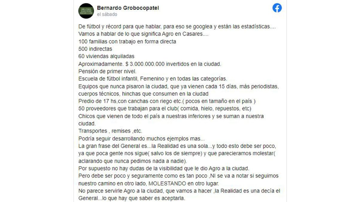 Fue una semana complicada por la derrota y eliminación ante Boca por la Copa Argentina. Quizás allí radique parte del enojo del empresario sojero Bernardo Grobocopatel al sugerir que existen “malos tratos” por parte del municipio de Carlos Casares hacia Agropecuario, el club del cual es fundador y presidente.
