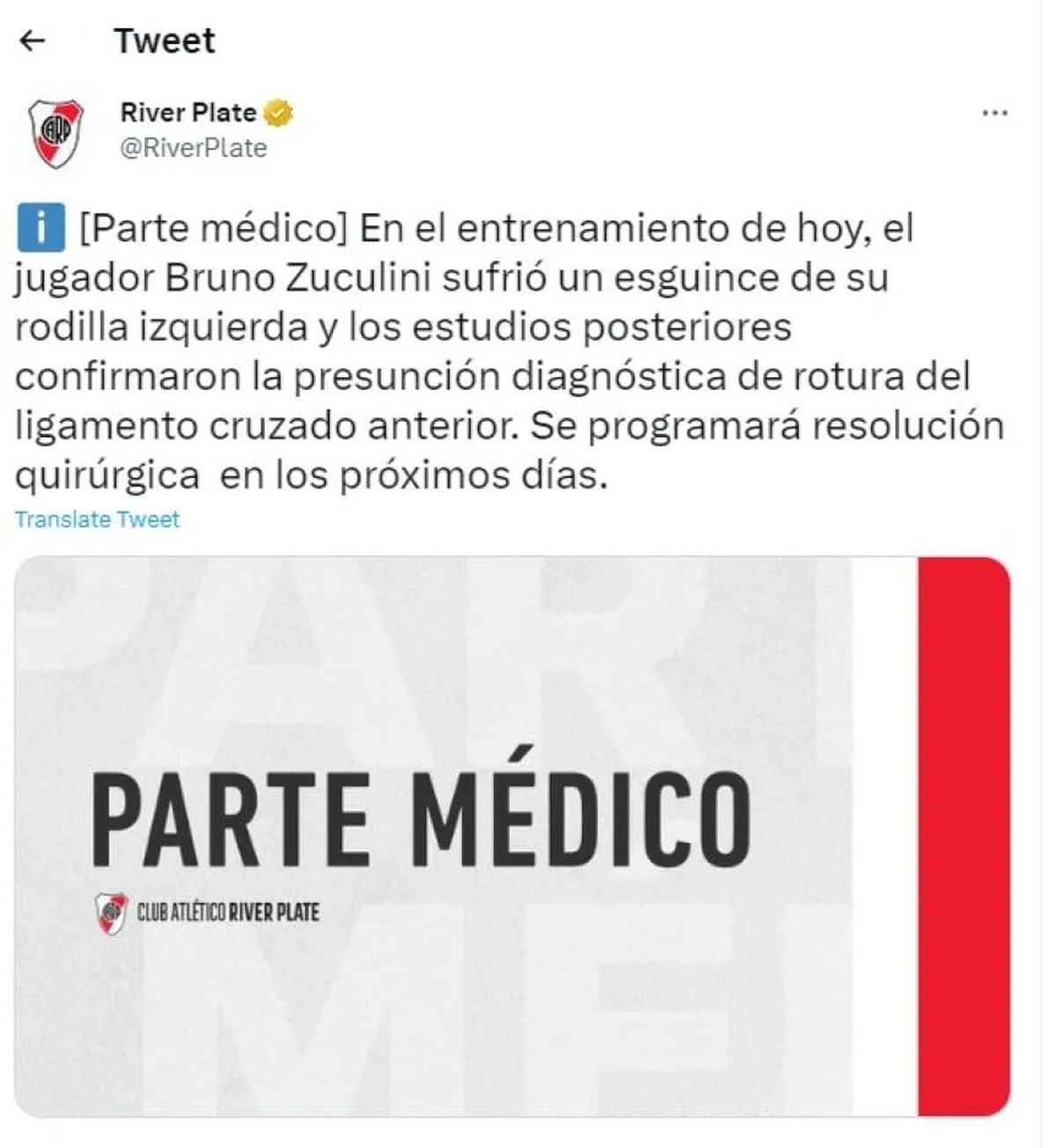 Bruno Zuculini sufrió la ruptura parcial del ligamento cruzado anterior de su pierna izquierda en la práctica de este martes y será baja en River. En las últimas horas, le hicieron estudios y finalmente el club publicó el parte médico oficial. La recuperación le demandaría menos de seis meses.