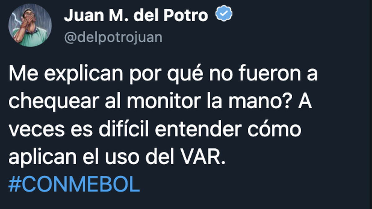 El empate 0-0 de Boca ante Corinthians dejó una polémica que enfureció a los hinchas xeneizes. En el complemento, un centro de Sebastián Villa se estrelló con la mano de Bruno Méndez y el chileno René Tobar no cobró. Uno de los hinchas xeneizes más furiosos fue Juan Martín Del Potro, quien en Twitter explotó de bronca.