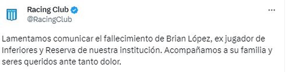 Una noticia dolorosa impactó en el fútbol argentino: Brian López, quien anteriormente formó parte de las divisiones inferiores de Racing, falleció en su ciudad natal, Rosario. El joven futbolista, de 24 años, había estado ligado a la institución de Avellaneda hasta el año 2020. Luego de su salida del club argentino, prosiguió su carrera en Canadá.