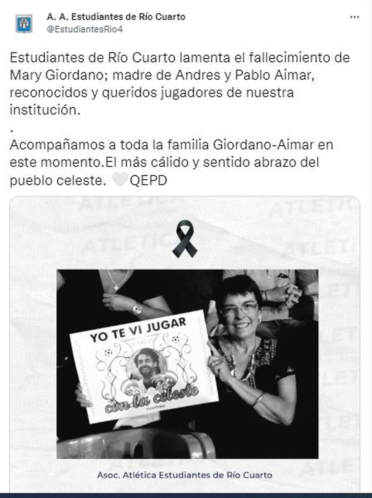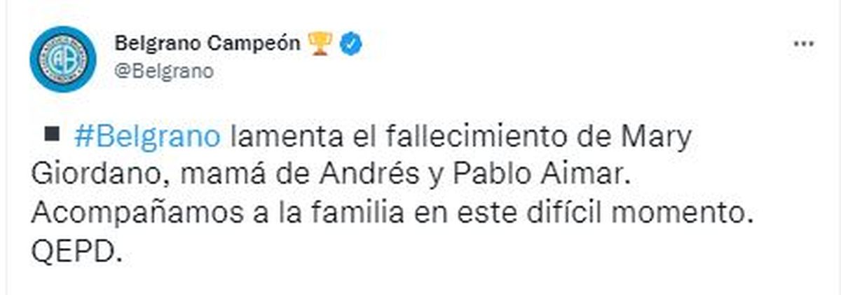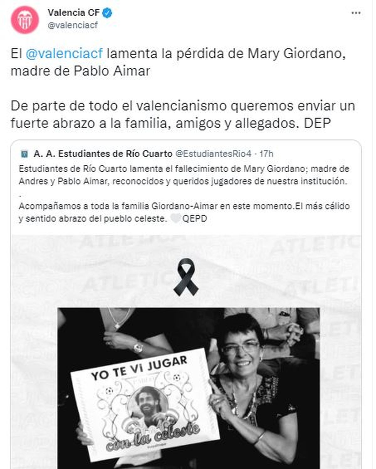 Este martes, una dura noticia golpeó a Pablo Aimar, entrenador de la Selección Argentina Sub 17 y miembro del cuerpo técnico de la Selección Mayor: su madre, Mary Giordano, murió a los 70 años, en su casa de Río Cuarto. Según informaron los medios cordobeses, el deceso habría sido de forma natural. Ante esta triste situación, el ambiente del fútbol abrazó al exfutbolista y le enviaron sus mensajes de apoyo.