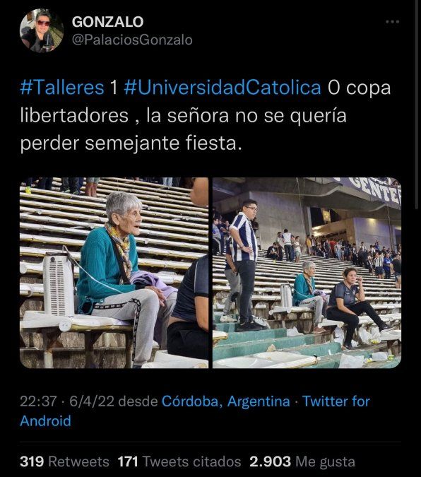 Córdoba está paralizada por la vuelta de los cuartos de final de la Copa Libertadores entre Talleres y Vélez. Ningún hincha de la T se lo quiere perder. Una de ellos es Elvira Reina, una hincha de Talleres que tiene 80 años y convive con fibrosis pulmonar, que se hizo viral tras un posteo de un hincha que la muestra en un partido del Matador en el Mario Alberto Kempes siguiendo a su equipo con una mochila de oxígeno.