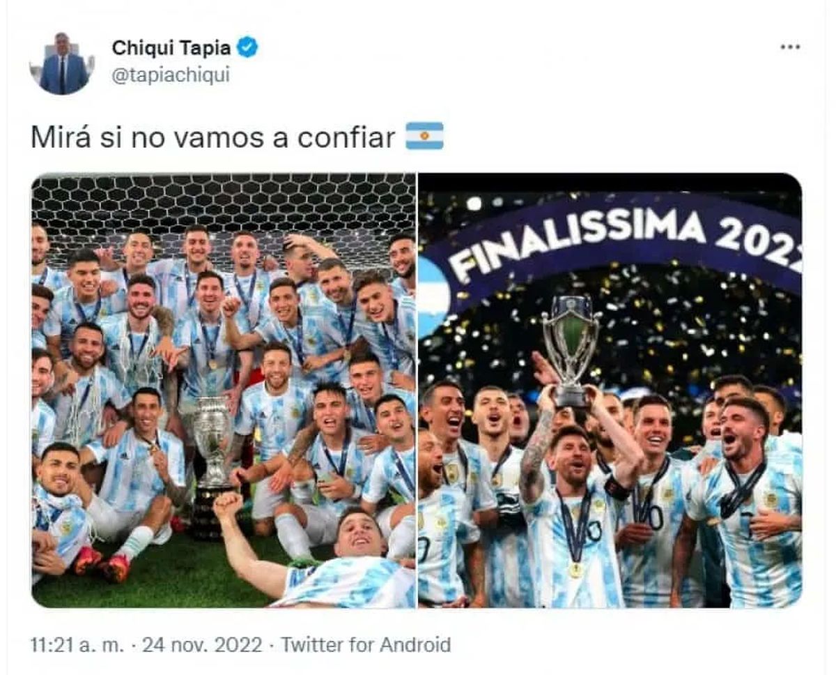 "Que la gente confíe, este grupo no los va a dejar tirados", declaró Lionel Messi luego de la derrota de la Selección Argentina por 2-1 ante Arabia Saudita, en la fecha 1 del Grupo C del Mundial Qatar 2022. La Scaloneta, que ya no tiene margen de error y debe ganar los dos partidos que faltan para pasar a octavos, jugará el sábado ante México y, en ese contexto, el presidente de la AFA, Claudio Chiqui Tapia, realizó un posteo muy optimista.