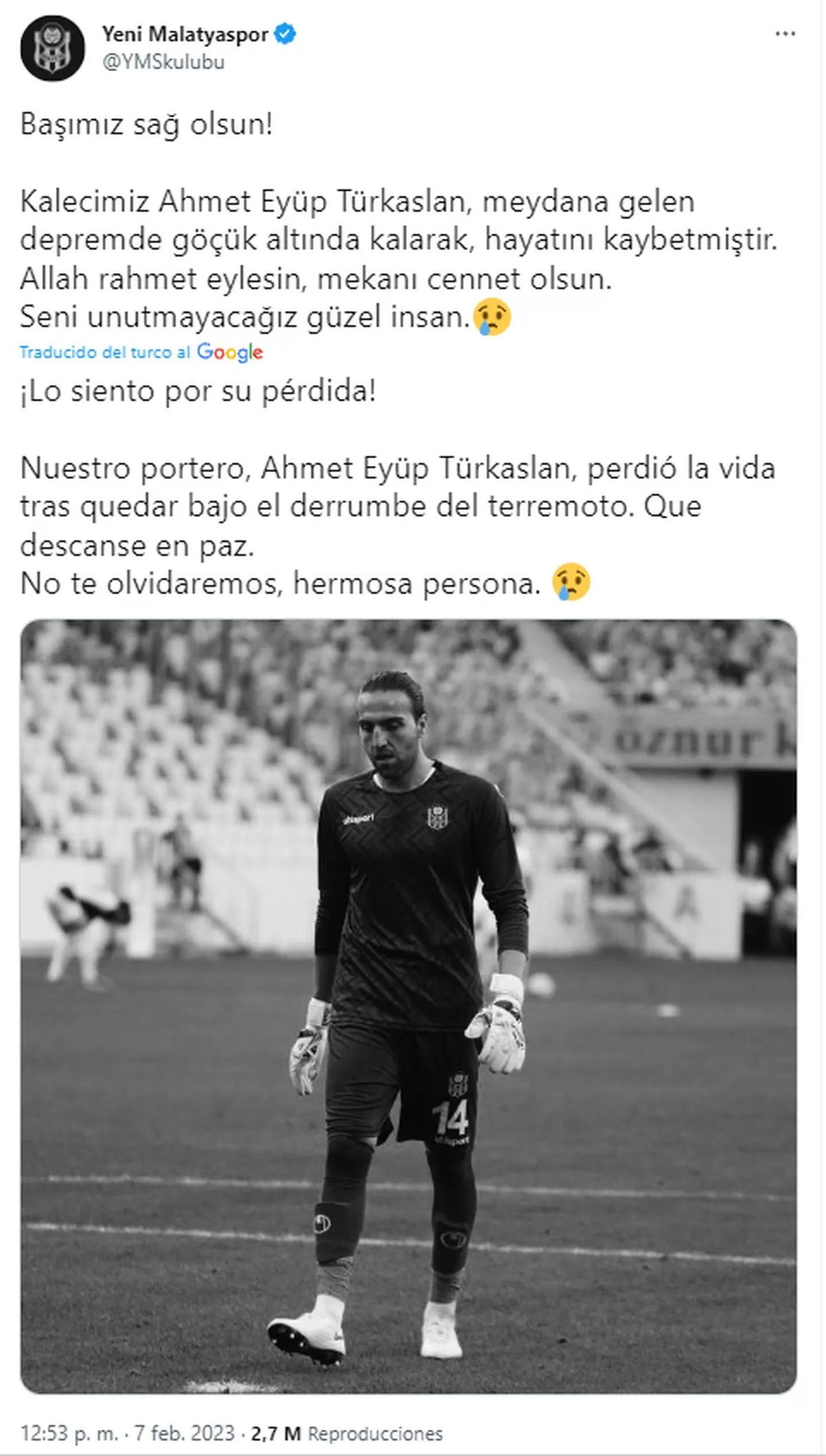 Ahmet Eyüp Türkaslan, arquero turco de 28 años, fue encontrado sin vida después del terremoto de 7,8 grados de la escala Richter que afectó a su país. El club Yeni Malatyaspor, fue el encargado de dar la noticia y, según informó, el futbolista había quedado atrapado bajo los escombros.