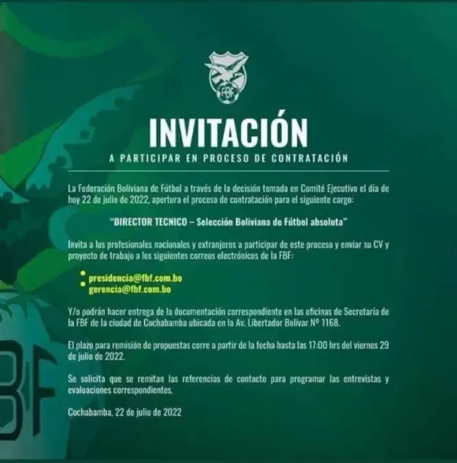 Bolivia no juega un Mundial desde el de Estados Unidos 1994. Por ese motivo, tras sumar su enésima actuación decepcionante en las Eliminatorias Conmebol bajo el mando de César Farías, la Federación Boliviana de Fútbol (FBF) anunció en la noche del día de ayer que iniciará un periodo de "casting" para contratar al nuevo entrenador de su Selección absoluta.
