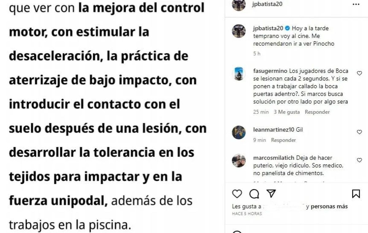 Marcos Rojo continúa en Miami, donde avanza en la rehabilitación de su desgarro de grado uno en el recto anterior derecho. Mientras tanto, el médico de Boca, Jorge Batista, realizó una publicación muy crítica en respuesta a una publicación de Julio César Murillo, el preparador físico con el que trabaja el capitán, en la que detallaba los ejercicios que el futbolista estaba realizando.