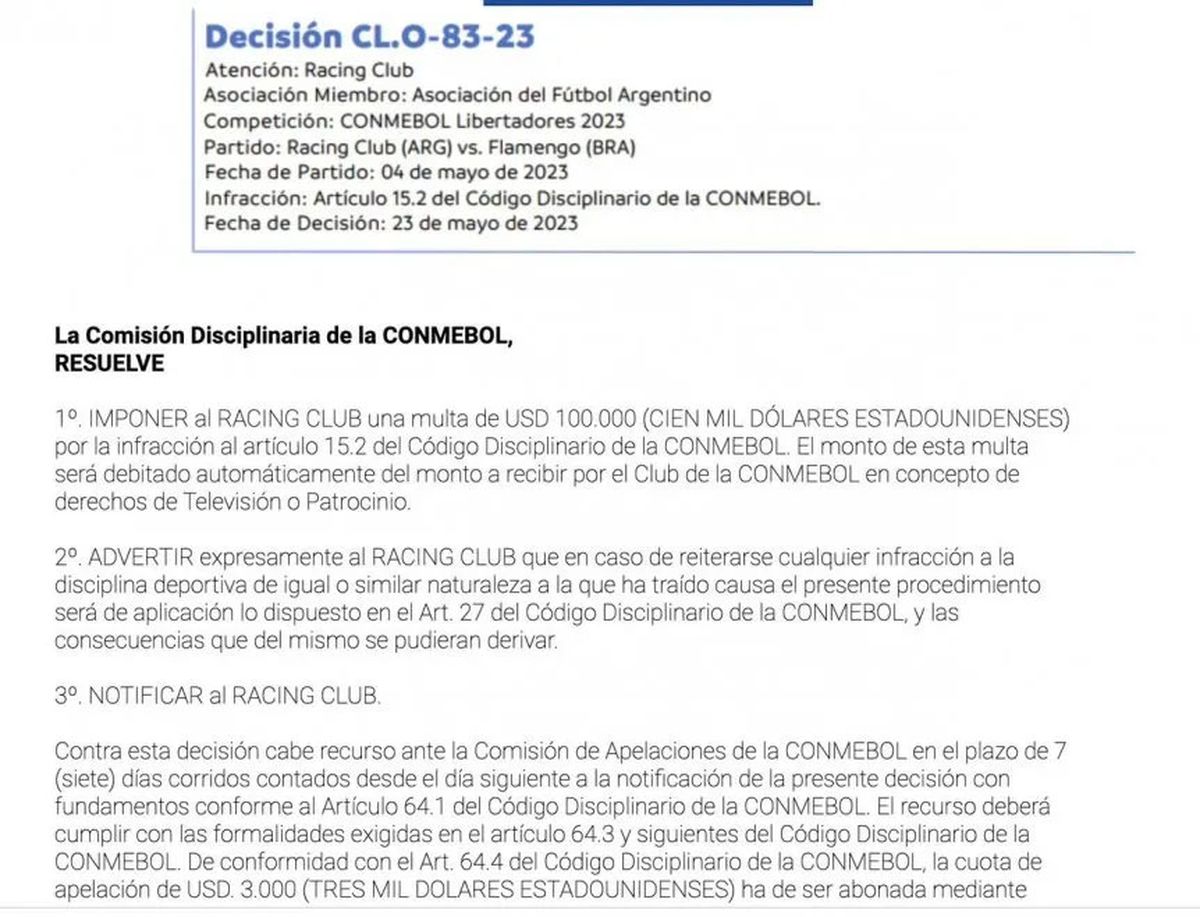 Este martes, la Confederación Sudamericana de Fútbol (CONMEBOL) impuso una multa a Racing debido a que sus hinchas cometieron actos racistas contra Flamengo, durante el partido que se disputó el 4 de mayo, por la Copa Libertadores. El conjunto de Avellaneda deberá abonar una multa que asciende a 100 mil dólares.