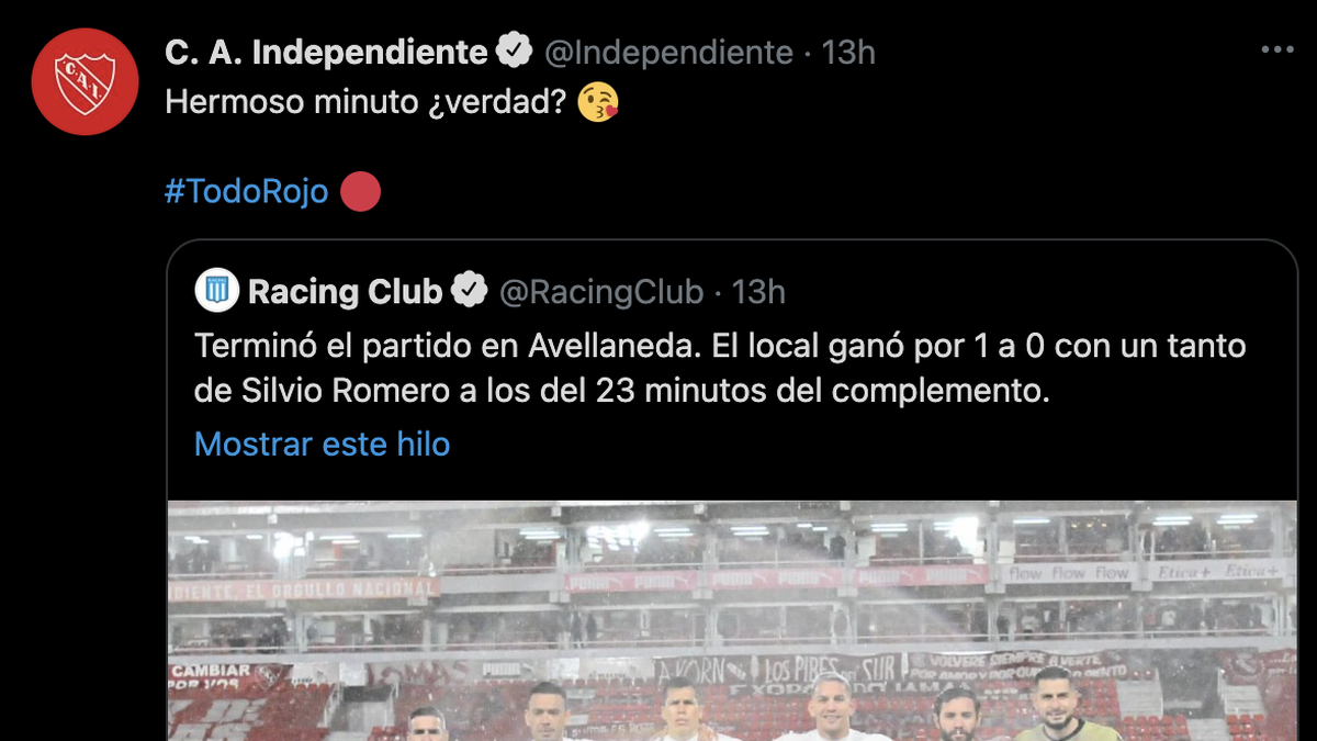En la era de redes sociales, los clásicos se juegan adentro y afuera de la cancha. Independiente derrotó 1-0 a Racing con gol de Silvio Romero, por la quinta fecha de la Liga Profesional y tras la victoria, la cuenta oficial del club publicó una serie de tuits con cargadas al clásico rival.