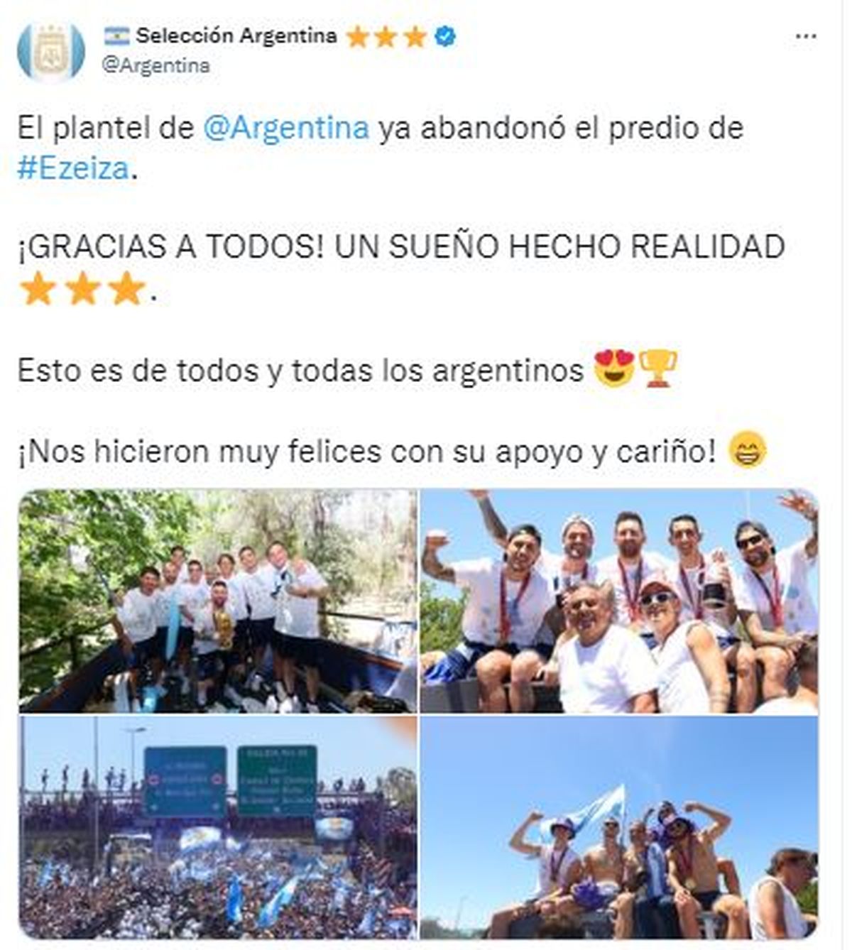 La Selección Argentina abandonó la concentración en el predio de la AFA en Ezeiza luego de la caravana para festejar la obtención del Mundial Qatar 2022. Los jugadores pasarán las fiestas junto a sus familiares y seres queridos y se tomarán unos días de descanso después de la competencia. Lionel Messi y Ángel Di María viajaron a su ciudad natal, Rosario, en donde podría realizarse un acto multitudinario en el Monumento a la Bandera para darles la bienvenida.