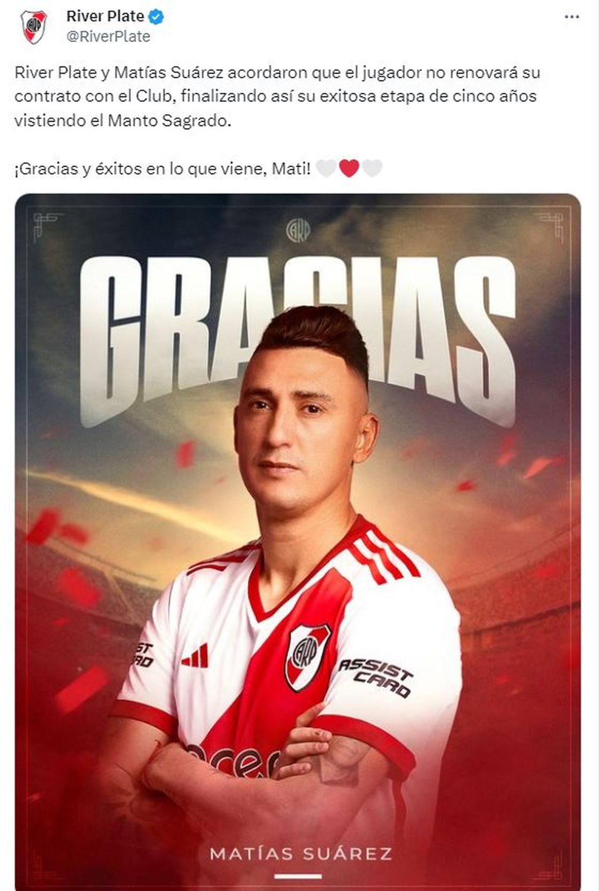 Después de una prolongada saga en torno a la renovación de Matías Suárez, finalmente se ha llegado a una conclusión: River anunció a través de sus redes sociales que el delantero cordobés no extenderá su contrato, que concluyó en diciembre, y le dio un emotivo adiós.