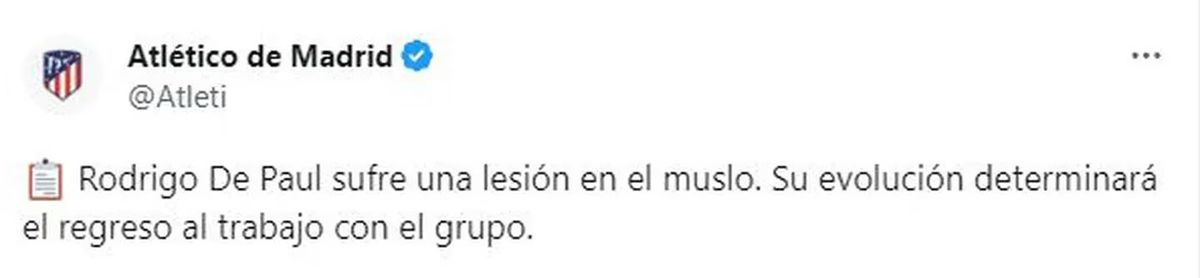 Este viernes, el Atlético de Madrid comunicó que Rodrigo De Paul sufrió un desgarro. El mediocampista regresó de su participación en la convocatoria de la Selección Argentina con problemas musculares y, cuando regresó a España, se sometió a exámenes médicos en una clínica privada, los cuales confirmaron la lesión.