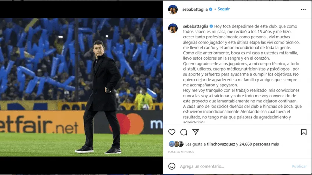 Sebastián Battaglia fue el principal perjudicado luego de la derrota ante Corinthians por penales, que derivó en la eliminación de Boca de la Copa Libertadores. ¿El motivo? El Consejo de Fútbol, con Juan Román Riquelme a la cabeza, le comunicó que no continuaría en su cargo. A través de sus redes sociales, el ahora ex DT del Xeneize se despidió del club, pero lo hizo con una frase muy polémica.
