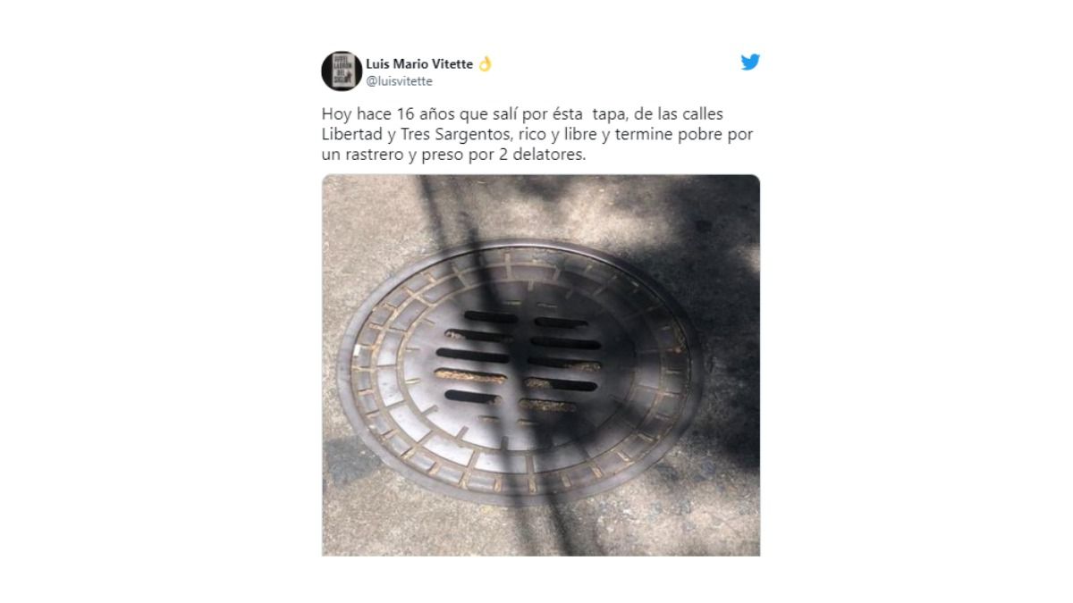 "Hoy hace 16 años que salí por ésta tapa, de las calles Libertad y Tres Sargentos, rico y libre, y terminé pobre por un rastrero y preso por 2 delatores", escribió Vitette y acompañó el mensaje con una foto de la tapa de la alcantarilla por la que pudieron escapar y burlarse de la policía luego del asalto.