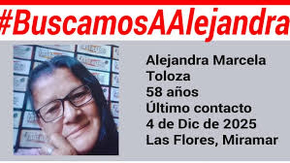 Una mujer de 58 años se encuentra desaparecida en la ciudad de Miramar desde el pasado jueves 4 de diciembre. Se trata de Alejandra Marcela Toloza, cuyo rastro se perdió alrededor de las 18.30 en la zona de Las Flores. Según relató su familia, ella atravesaba un estado emocional delicado y antes de irse dejó en su estado de WhatsApp un mensaje de despedida: “Chau”.