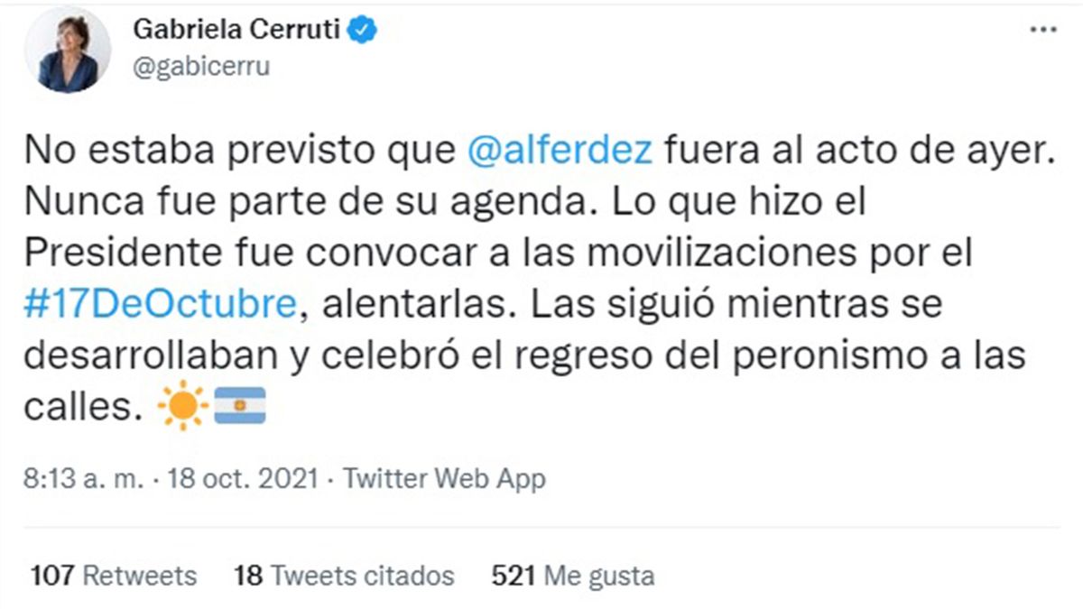 “Conocemos, respetamos y queremos a Hebe de Bonafini. Conocemos su discurso y su vocación por determinadas políticas, así como la plaza estaba llena de militancia, de funcionarios, de diputados y diputadas, del gobernador de la provincia de Buenos (Axel Kicillof). El Presidente siguió las actividades del acto, estaba contento y celebra que se haya llevado adelante”, aseguró Cerruti en declaraciones a Radio Urbana Play.