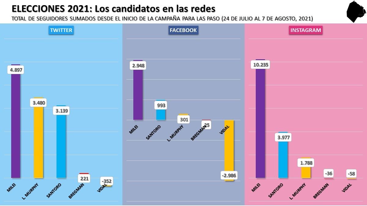 El precandidato del radicalismo en Juntos por el Cambio, Facundo Manes, es el dirigente de más influencia digital. Suma casi 2 millones 300 mil seguidores seguido por el exministro kirchnerista Florencio Randazzo, con casi 1 millón. Más atrás se ubica el exvicejefe de gobierno porteño, Diego Santilli (823 mil), el economista liberal José Luis Espert (687 mil), el diputado de izquierda Nicolás del Caño (434 mil) y finalmente la precandidata del Frente de Todos Victoria Tolosa Paz (224 mil seguidores).
