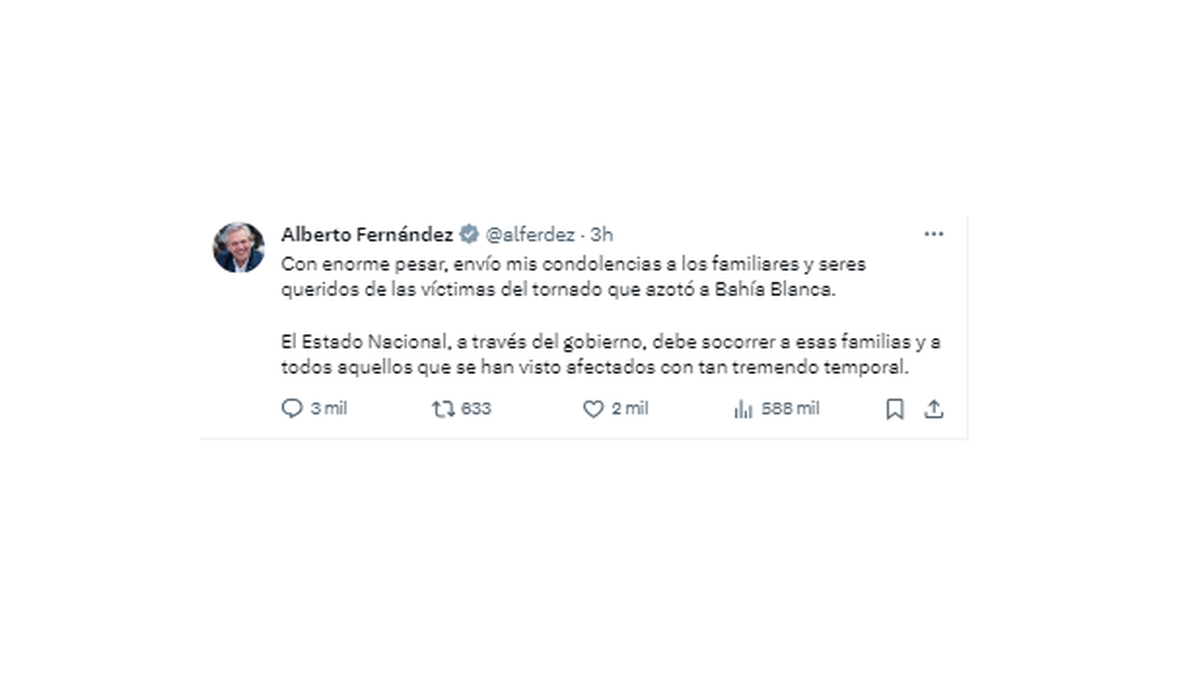 El expresidente Alberto Fernández envió sus condolencias a los familiares de las víctimas del temporal en la ciudad bonaerense de Bahía Blanca y dijo que "el Estado nacional debe socorrer" a quienes se hayan visto afectados, luego de que el actual mandatario, Javier Milei, y parte de su gabinete viajaran al lugar para seguir de cerca la situación y coordinar tareas con el gobierno bonaerense.