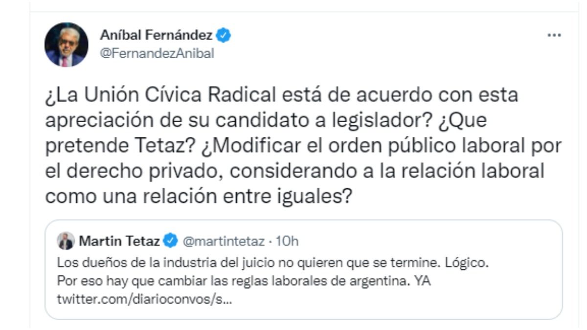 Luego de la derrota en la Paso y de nuevas asunciones en el gabinete nacional, Aníbal Fernández, arremetió contra Martín Tetaz por su postura sobre la reforma laboral. Mediante un tweet, el funcionario nacional se refirió a las ideas del candidato a diputado nacional, quien desde hace varios meses viene planteando modificaciones en el ámbito del trabajo, generalmente apuntado a mayor flexibilización.