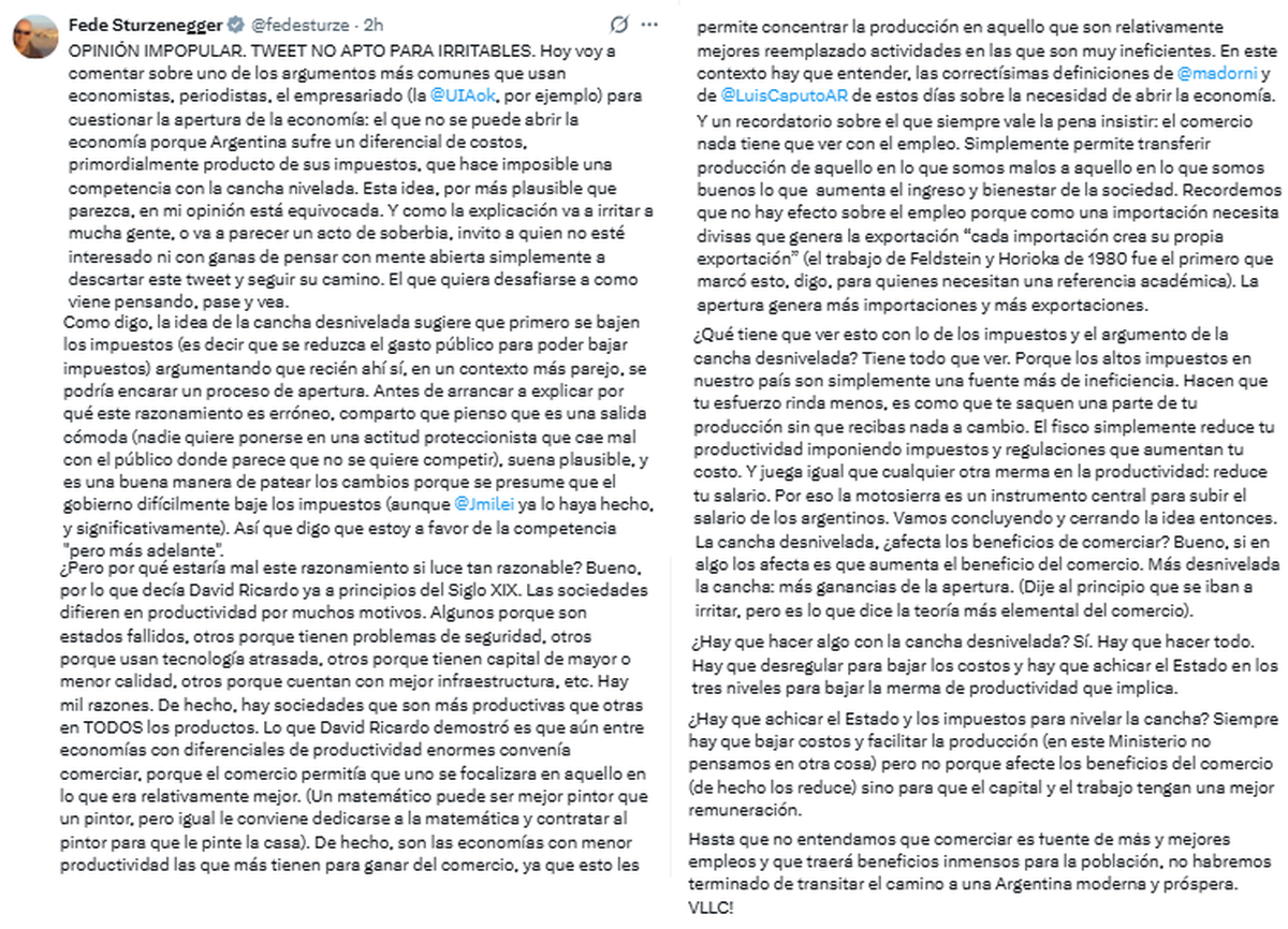 En ese contexto, Sturzenegger publicó un extenso mensaje en redes sociales en el que buscó refutar lo que definió como el “razonamiento de la cancha desnivelada”, un argumento habitual, según señaló, entre economistas, empresarios y referentes gremiales que sostienen que la industria nacional no puede competir con el exterior debido a los altos costos locales, especialmente los impuestos.