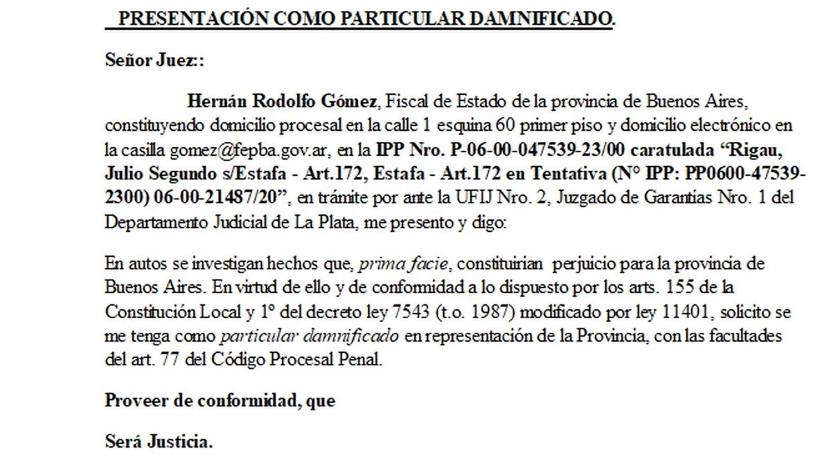 Por el caso de Julio "Chocolate" Rigau, el puntero que fue encontrado sacando dinero de un cajero de 48 tarjetas de débito de empleados de la Legislatura bonaerense y por lo cual se encuentra detenido, el Gobierno de la Provincia de Buenos Aires le pidió al juez Guillermo Federico Atencio ser querellante en la causa.