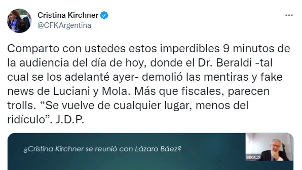 “Comparto con ustedes estos imperdibles 9 minutos de la audiencia del día de hoy, donde el Dr. Beraldi -tal cual se los adelanté ayer- demolió las mentiras y fake news de Luciani y Mola. Más que fiscales, parecen trolls. 'Se vuelve de cualquier lugar, menos del ridículo'. J.D.P.”, escribió Cristina Kirchner en Twitter.