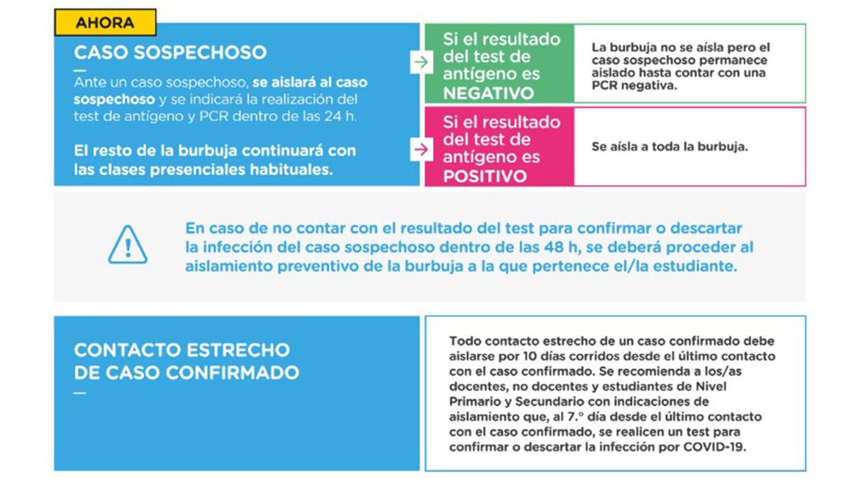 Si el resultado del test es positivo: se aísla a toda la burbuja por diez días corridos desde el último contacto con el caso confirmado.