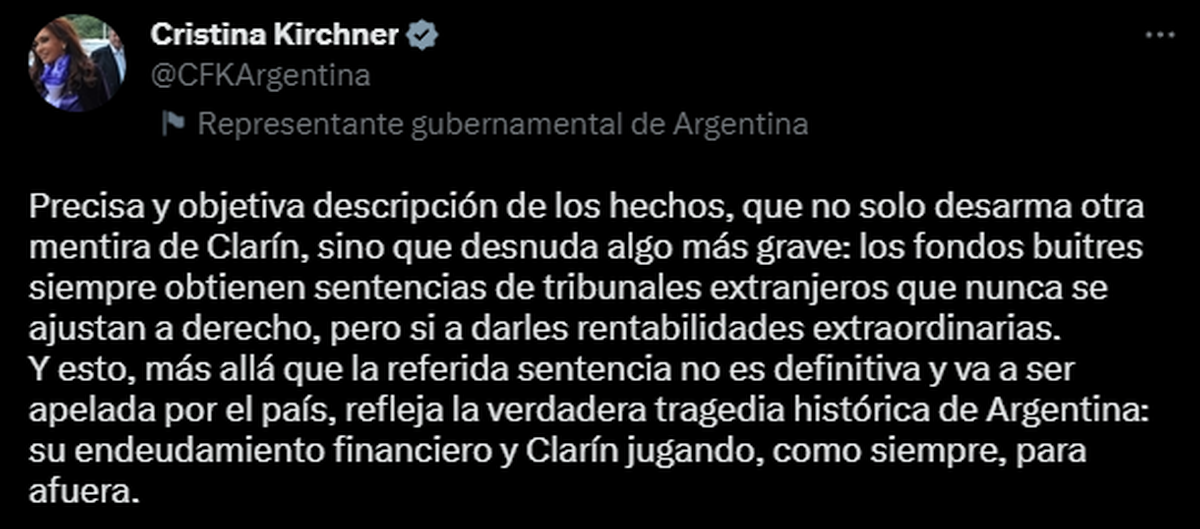 La vicepresidenta Cristina Fernández de Kirchner se expresó este jueves en contra del fallo judicial del Tribunal Superior de Londres que ordenó al Estado argentino a pagarle 1.300 millones de dólares a fondos inversores que denunciaron una alteración en el método de cálculo de una serie de bonos denominados "cupones PBI".