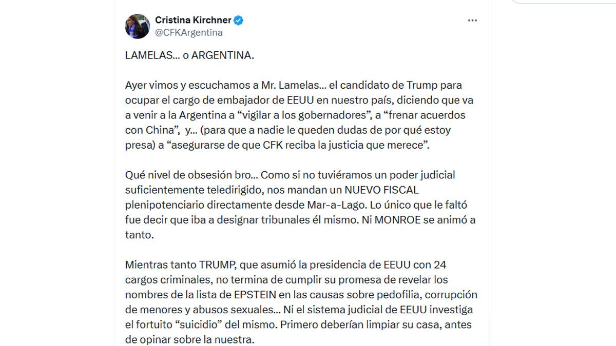 Sobre la "influencia" de Estados Unidos, CFK escribió: "Nos mandan un NUEVO FISCAL plenipotenciario directamente desde Mar-a-Lago. Lo único que le faltó fue decir que iba a designar tribunales él mismo. Ni MONROE se animó a tanto. Mientras tanto, TRUMP, que asumió la presidencia de EE. UU. con 24 cargos criminales, no termina de cumplir su promesa de revelar los nombres de la lista de EPSTEIN en las causas sobre pedofilia, corrupción de menores y abusos sexuales…".