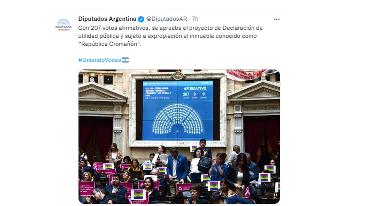 La Cámara de Diputados aprobó este miércoles por unanimidad y envió al Senado el proyecto que busca expropiar el edificio donde funcionó el boliche República Cromañón, donde murieron 194 jóvenes y centenares sufrieron heridas durante un incendio el 30 de diciembre de 2004, para convertirlo en un espacio dedicado a la memoria.