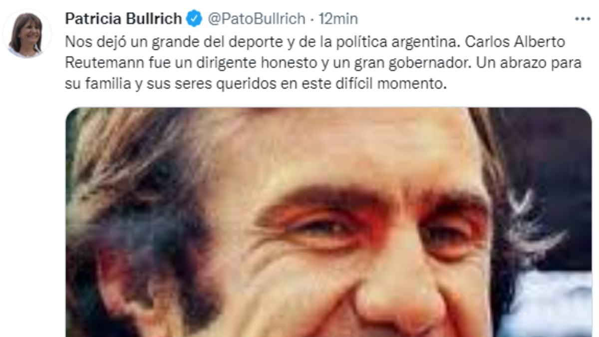 "Nos dejó un grande del deporte y de la política argentina. Carlos Alberto Reutemann fue un dirigente honesto y un gran gobernador. Un abrazo para su familia y sus seres queridos en este difícil momento", dijo Bullrich.