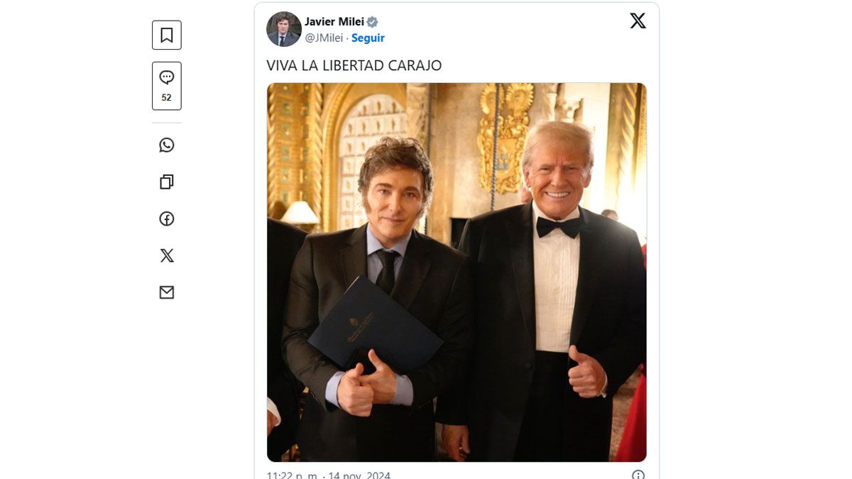 Según el mandatario, Trump enfrentó a todo el "establishment político" que lo hizo poner en riesgo su propia vida. "Gracias a ello, el mundo de hoy es mucho mejor, porque los vientos de la libertad soplan más fuertes", resumió Milei. Enseguida sumó una de sus frases preferidas: "Las fuerzas del cielo están de nuestro lado".