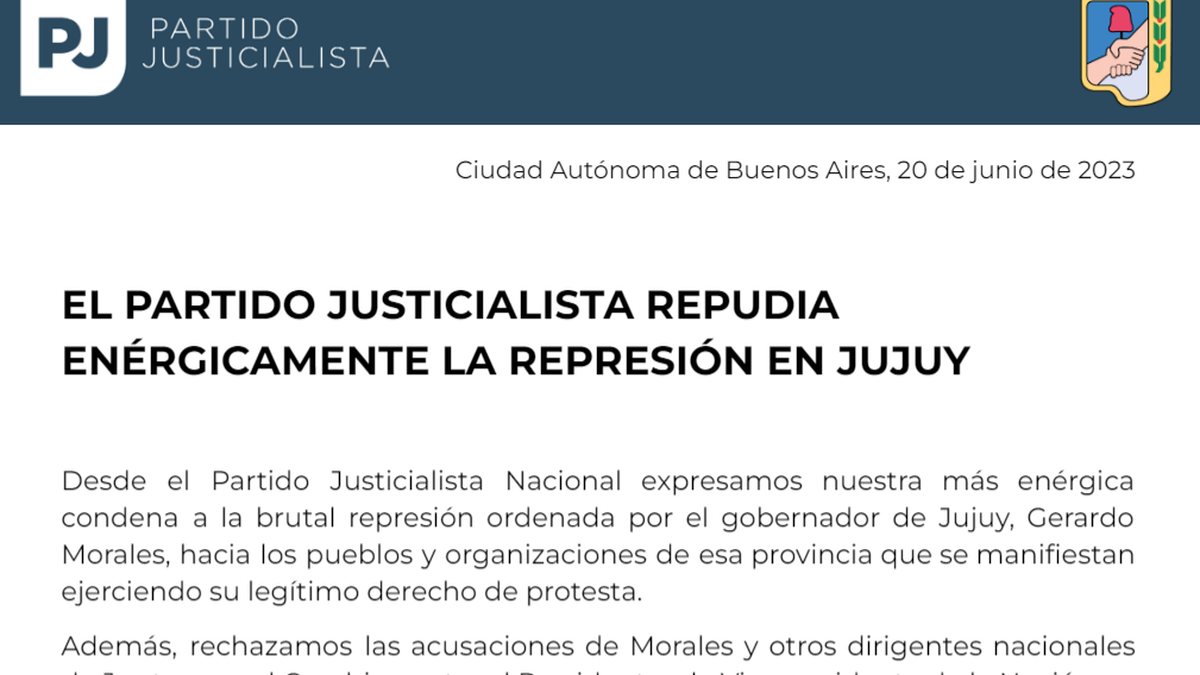 En un comunicado del Partido Justicialista, la fuerza política hizo responsable de lo ocurrido en Jujuy a Gerardo Morales y expresó su "más enérgica condena a la brutal represión ordenada por el gobernador hacia los pueblos y organizaciones de esa provincia que se manifiestan ejerciendo su legítimo derecho a protesta”.