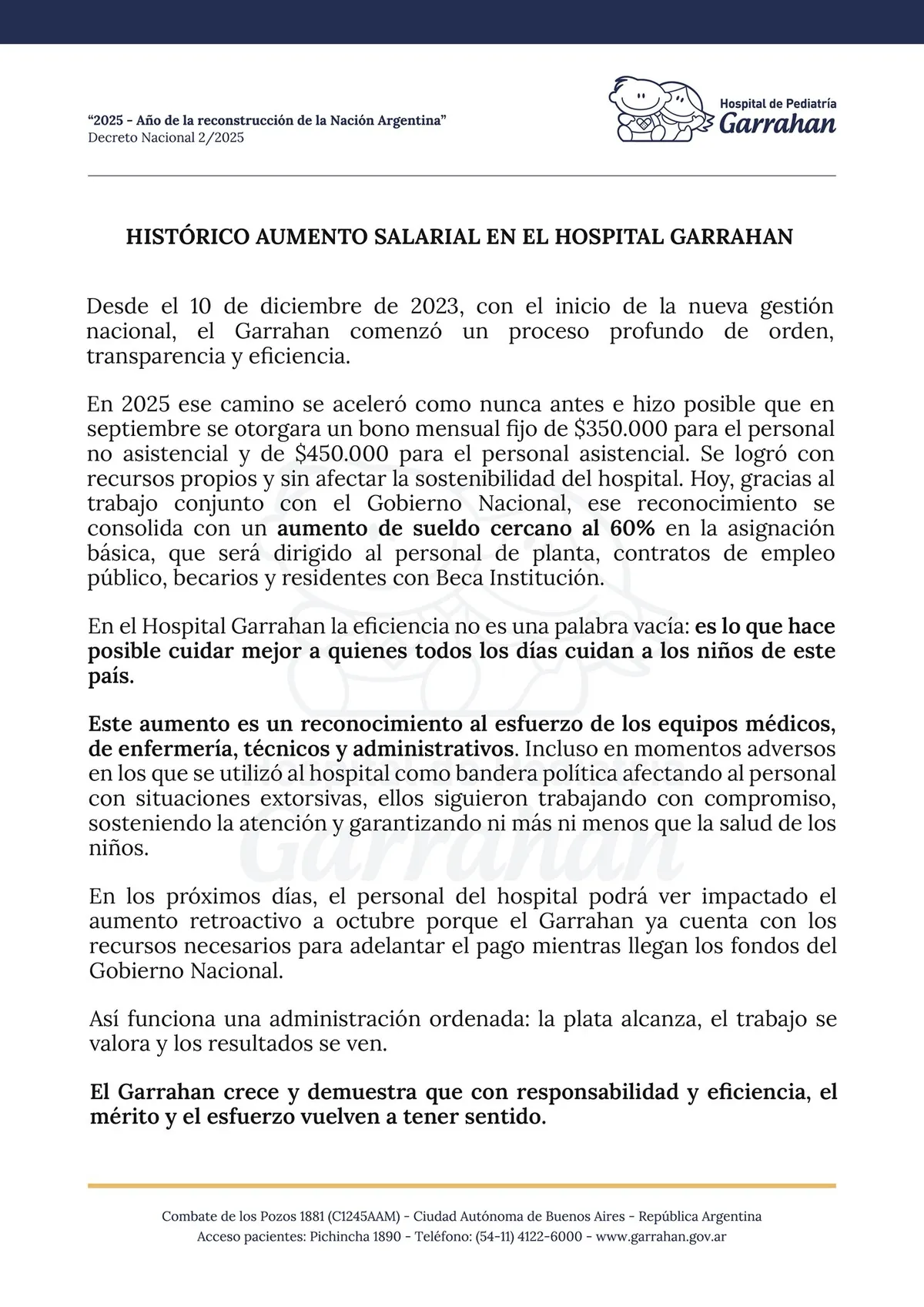 “El Garrahan crece y demuestra que con responsabilidad y eficiencia, el mérito y el esfuerzo vuelven a tener sentido”, concluye el comunicado.