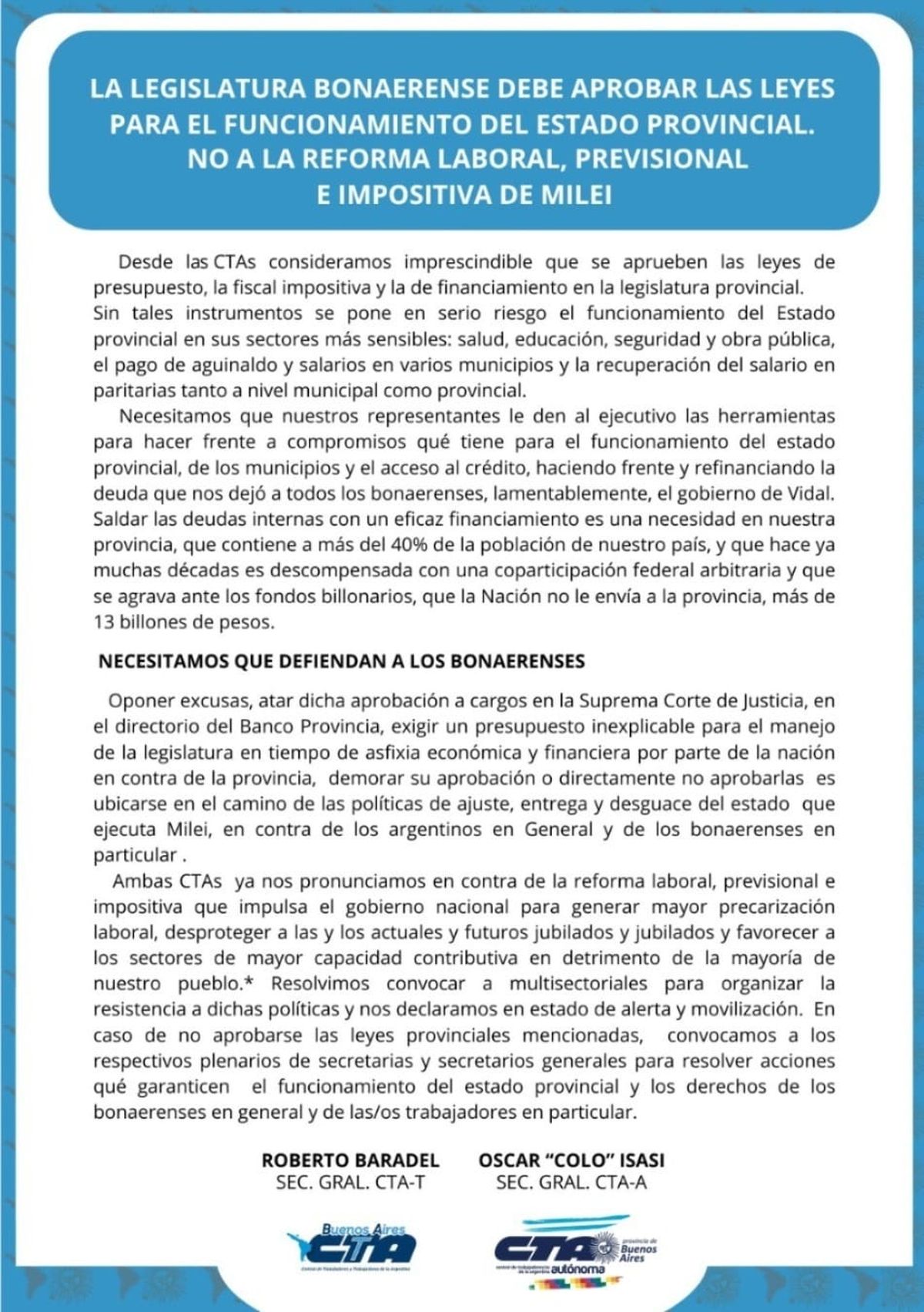 La CTA de los Trabajadores y la CTA Autónoma emitieron hoy un comunicado conjunto titulado "La Legislatura bonaerense debe aprobar las leyes para el funcionamiento del Estado provincial. No a la reforma laboral, previsional e impositiva de Milei" como un respaldo a la gestión del gobernador bonaerense.