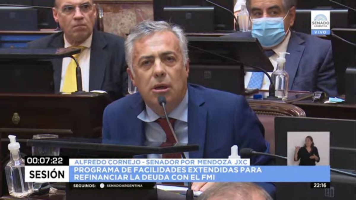 Alfredo Cornejo, senador nacional por Juntos por el Cambio, se refirió este jueves al acuerdo en el Congreso. "No vamos a votar por el acuerdo con el Fondo Monetario Internacional; nosotros estamos autorizando una refinanciación de la deuda, pero el acuerdo con el FMI lo puede hacer solamente el Gobierno, que es quien se hará cargo de cumplir los compromisos", indicó en CNN Radio Argentina