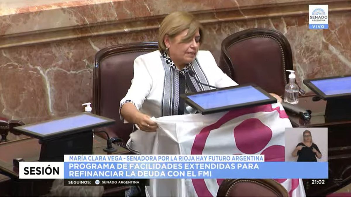 La senadora María Clara Vega, del espacio político "Hay Futuro Argentina", comenzó su alocución de una forma curiosa: desplegó una bandera de fondo blanco, círculo rosa con tres esferas también de ese color dentro que simboliza la paz y afirmó que se trata de un emblema que "todos deben hacer flamear". Al mismo tiempo fijó su posición de acompañar el acuerdo con el FMI y unirse contra "las adversidades".