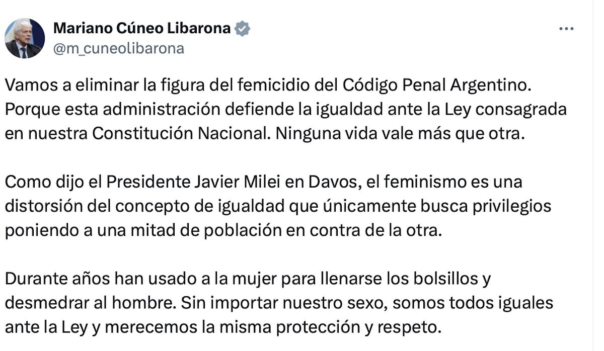 El ministro de Justicia, Mariano Cúneo Libarona, confirmó este viernes la intención del gobierno de Javier Milei de eliminar la figura de femicidio del Código Penal Argentino. Según el funcionario, la decisión responde a una visión que busca garantizar la igualdad ante la ley, alineada con lo consagrado en la Constitución Nacional. Esta postura también incluyó críticas al feminismo, al que Cúneo Libarona calificó como “una distorsión del concepto de igualdad”.