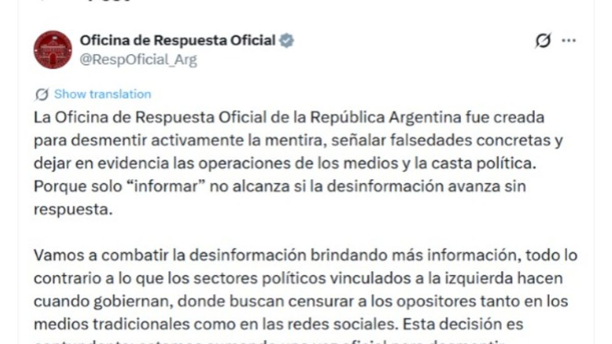 “La democracia no se fortalece cuando se tolera la mentira, sino cuando se la expone. La Oficina de Respuesta Oficial existe para eso: para que la desinformación no quede sin respuesta y para que la verdad vuelva a ser información”, concluyó el primer mensaje de la Oficina de Respuesta Oficial de la República Argentina.