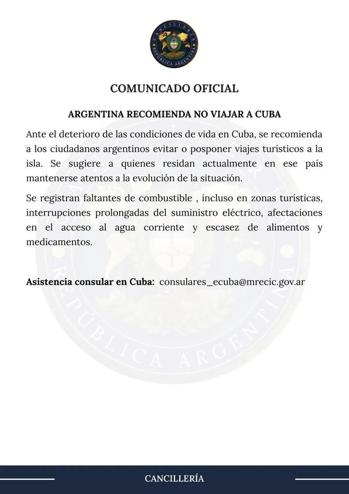 En un comunicado, el Ministerio de Relaciones Exteriores indicó que "ante el deterioro de las condiciones de vida en Cuba, se recomienda a los ciudadanos argentinos evitar o posponer viajes turísticos a la isla".