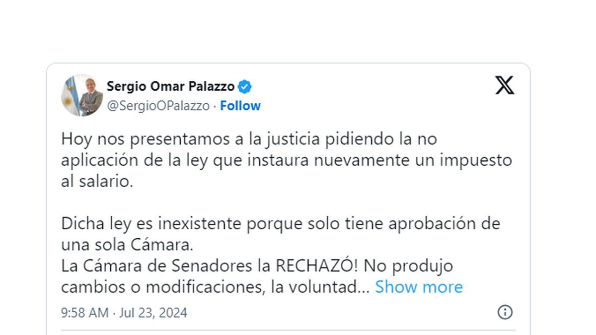 Sergio Palazzo aseguró que la ley que vuelve a aplicar el gravamen sobre casi un millón de trabajadores en relación de dependencia, "además de ilegítima e injusta, también viola diversos principios".