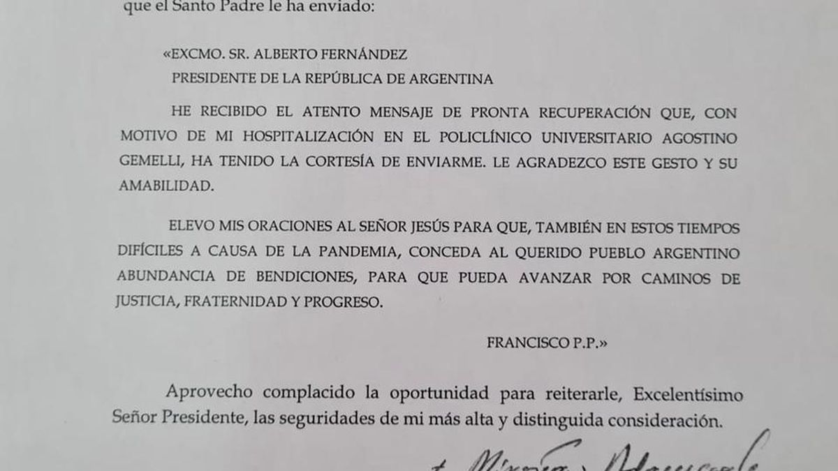 El presidente Alberto Fernández recibió este jueves una carta del papa Francisco, en la que le agradece el mensaje que en su momento le hiciese llegar a Su Santidad con motivo de haberse sometido hace 10 días a una cirugía por divertículos en el colon, en un policlínico de Roma, de la cual fue dado de alta ayer.