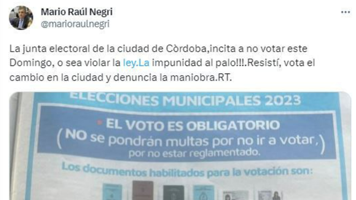 Tras la difusión de la solicitada firmada por el Tribunal Electoral municipal de Córdoba Capital, Mario Negri fue uno de los primeros en criticar de manera pública el mensaje. “La junta electoral de la ciudad de Córdoba incita a no votar este domingo, o sea violar la ley”, indicó.