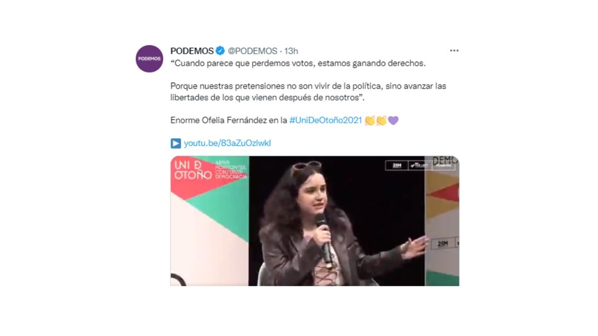 La legisladora de la Ciudad Autónoma de Buenos Aires por el Frente de Todos, Ofelia Fernández, viajó este fin de semana a España y participó de una exposición que organiza cada año el partido Podemos de la extrema izquierda del escenario político. En dicha charla, apuntó contra “la ultraderecha”, como ella definió a los sectores que la atacan, por ser “blanco de ataques, amenazas y operaciones” que la convierten en tendencia en Twitter “todas las semanas”.