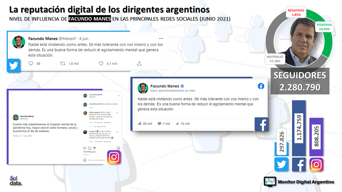 Manes logra sumar más seguidores en Facebook (1,1 millones), por encima de los 808 mil de Instagram y poco menos de 300 mil en Twitter. Estos números muestran en el científico un perfil de fuerte anclaje entre los sectores medios, buena llegada a los sectores jóvenes que dominan Instagram, pero con un anclaje discreto en Twitter, la red social política por excelencia.