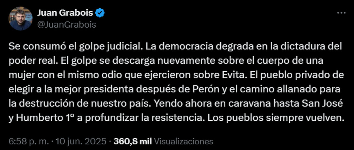 El dirigente del Frente Patria Grande, Juan Grabois, consideró esta noche que tras el fallo de la Corte Suprema de Justicia en la causa Vialidad "se consumó el golpe judicial" contra la expresidenta Cristina Fernández de Kirchner y lamentó que tras la condena que la inhabiilta a ejercer cargos públicos "el pueblo" se verá "privado de elegir a la mejor presidenta después de Perón".