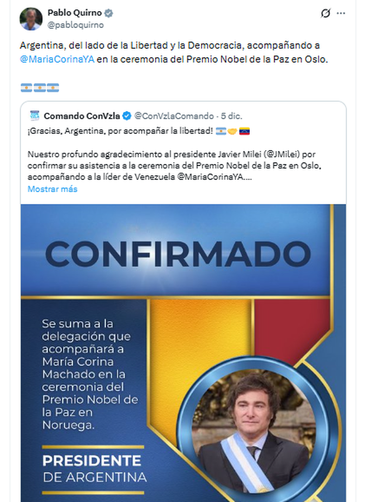 La primera confirmación pública del viaje llegó a través de un mensaje publicado en redes por la opositora venezolana Elisa Trotta, radicada en Argentina: “¡Gracias, Argentina, por estar del lado de la libertad! Nuestro profundo agradecimiento al presidente Milei por confirmar su presencia en la ceremonia en Oslo para la entrega del Premio Nobel de la Paz a María Corina. Este gesto refleja el compromiso de Argentina con la democracia, la justicia y la defensa de los derechos humanos”, escribió.