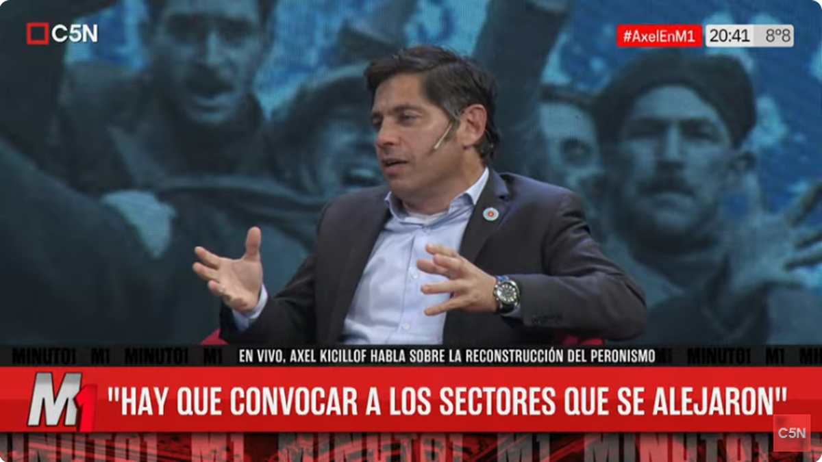 "Estoy convocando a una mesa para que se empiece a hablar la forma de hacer una lista conjunta. Es un compromiso, lo hicimos público", confió Kicillof sobre el acuerdo realizado en el peronismo y que se formalizará con su llamado en los próximos días. Al respecto reconoció "que hay diferencias" en ese espacio pero sintetizó: "Yo creo que esta coyuntura implica que hagamos el esfuerzo de buscar una estrategia electoral respetuosa de las representatividades, que permita ponerle un frena a Milei".