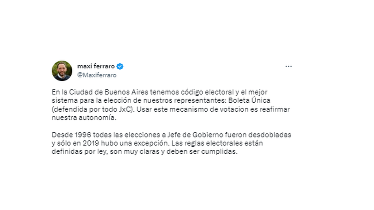 "En la Ciudad de Buenos Aires tenemos código electoral y el mejor sistema para la elección de nuestros representantes: Boleta Única (defendida por todo JxC). Usar este mecanismo de votación es reafirmar nuestra autonomía", tuiteó Maxi Ferraro.