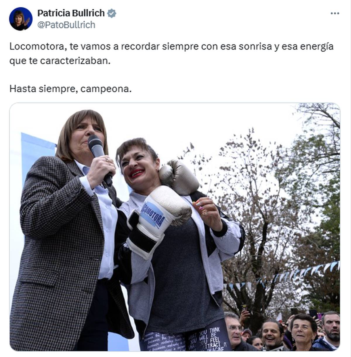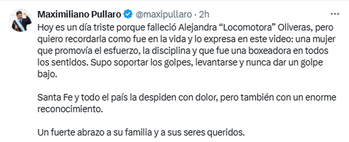 Luego de la muerte de Alejandra “Locomotora” Oliveras, el presidente Javier Milei compartió esta noche un mensaje de despedida para la exboxeadora. “Adiós Locomotora”, escribió en redes sociales junto a una imagen con la deportista jujeña, y publicó también un video de un acto de campaña en el que ella expresaba públicamente su apoyo al entonces candidato libertario.