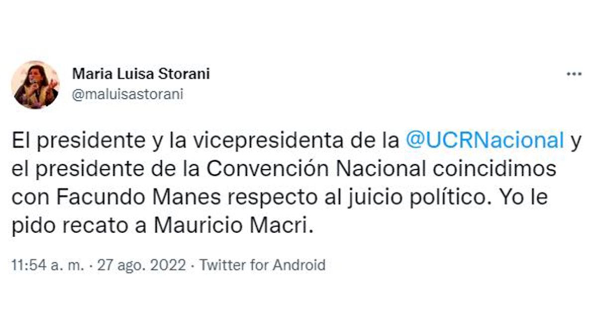 La tensión al interior de Juntos por el Cambio no cesa, y las diferencias en torno al pedido de juicio político a Alberto Fernández se profundizan. A través de un tweet, la vicepresidenta de la UCR, María Luisa Storani reveló que junto al titular de la fuerza, Gerardo Morales, y al presidente de la Convención Nacional, Gastón Manes, respaldan y suscriben a los argumentos de Facundo Manes en contra de la exigencia. "Yo le pido recato a Mauricio Macri", expresó en Twitter.